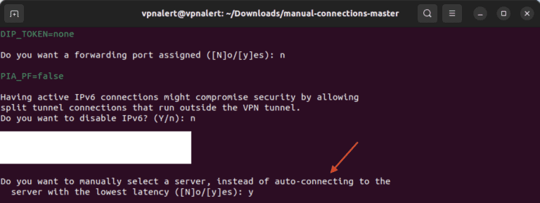 - 输入“Y”(是)或“N”(否)以允许或禁用 IPv6。我建议禁用它,因为它有时会干扰您的 VPN 连接。