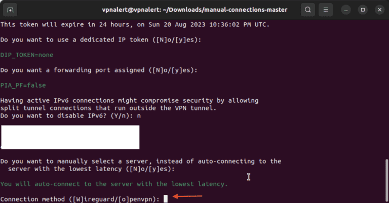 - 按“W”选择 WireGuard 协议或按“o”选择 OpenVPN 连接方法。我将为本指南选择 WireGuard。