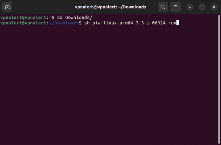 - 使用命令“sh [Linux PIA 文件的文件名]”。在这种情况下,我输入了命令“sh pia-linux-arm64-3.3.1-06924.run”。