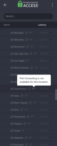 - 单击支持端口转发的服务器。请注意,任何不支持端口转发的服务器位置都将显示为灰色。当您将鼠标悬停在其上时,您将收到消息“端口转发不适用于此位置”。