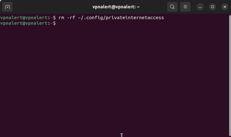 - 输入命令“rm -rf ~/.config/privateinternetaccess”并按 Enter 键。