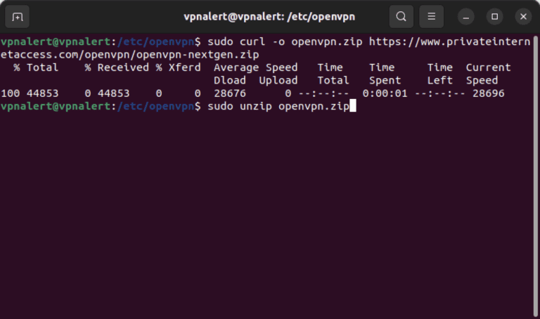 - 使用命令“下载 PIA Linux zip 文件须藤wgethttps://www.privateinternetaccess.com/openvpn/openvpn-nextgen.zip“ 或者 ”sudo curl -o openvpn.zip”https://www.privateinternetaccess.com/openvpn/openvpn-nextgen.zip”