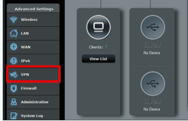 - 打开路由器的设置页面并单击“VPN”在左侧菜单上。