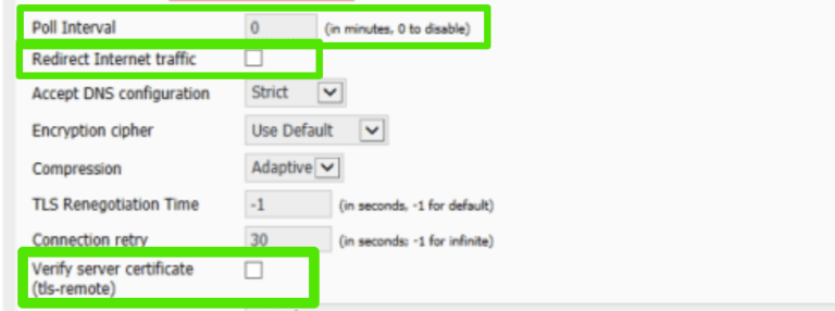 - 取消选中“重定向互联网流量“ 和 ”验证服务器证书”。