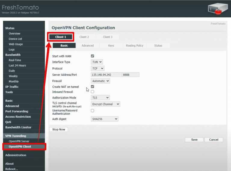 - 点击 ”OpenVPN客户端,“ 选择 ”客户1”。