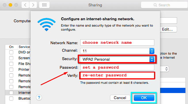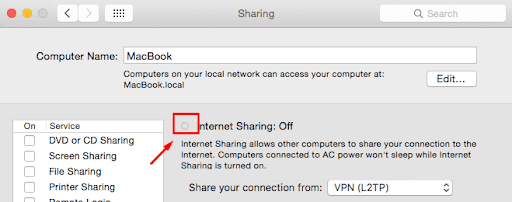 第7步:选择 ”互联网共享”从左侧面板和右侧,设置以下内容: