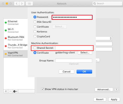 第5步:打开认证设置并输入您的VyprVPN 密码在密码字段中。