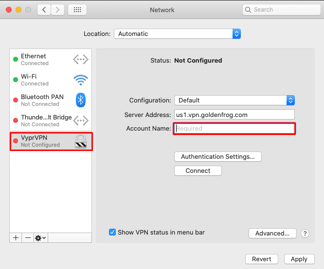 - 服务器IP/名称:选择并输入所需的 VyprVPN 服务器。可以找到各种服务器地址这里。