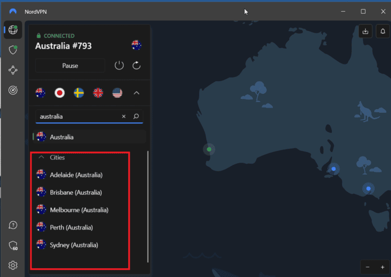 NordVPN 是190+ 澳大利亚服务器穿过墨尔本,珀斯,布里斯班,阿德莱德, 和悉尼。