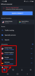 - 要更改服务器位置,请点击地球图标在屏幕的左下角。