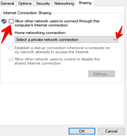 - 接下来,单击分享选项卡,然后选中“允许其他网络用户通过此计算机的 Internet 连接进行连接”。