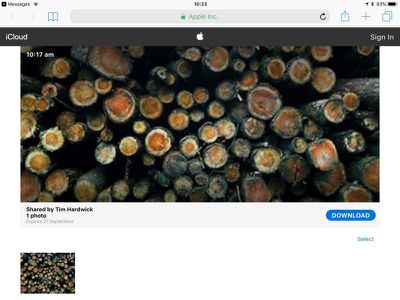 点击缩略图/URL 链接会将他们带到与上面类似的 iCloud.com 网页,其中包含预览图像、作者姓名、照片标题、到期日期以及下载照片或将其添加到现有 Apple 照片库的选项。如果共享了多张照片,收件人可以选择要添加或下载的照片。
