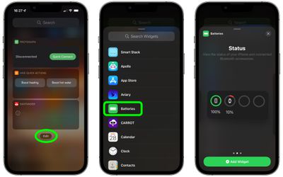为此,请长按“主屏幕”或任何其他应用程序屏幕的空白区域以进入抖动模式。点击加屏幕左上角的 (+) 按钮打开小部件库,然后在搜索字段中输入“电池”或向下滚动并选择电池列表中的小部件。
