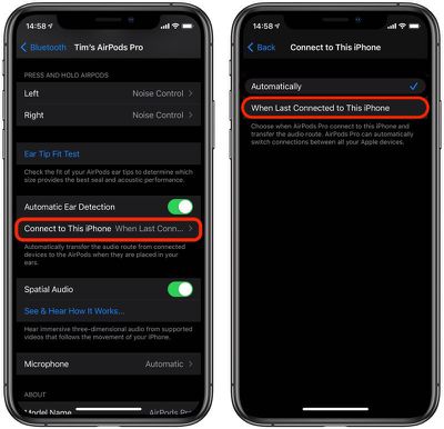 选择后一个选项后,您的 AirPods 将自动尝试连接到上次连接的设备。换句话说,如果您上次使用 AirPods 在 iPhone 上听过一些内容,然后稍后再次佩戴它们,它们会尝试连接到您的 iPhone。
