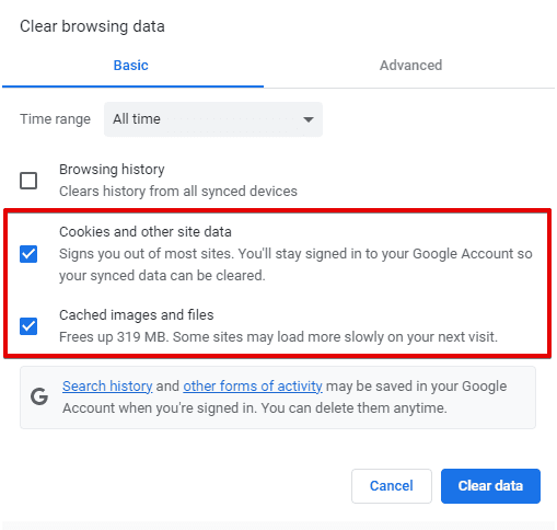 - 标记“缓存的图像和文件“ 和 ”Cookie 和其他网站数据”盒子。