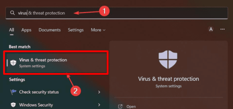 - 搜索 ”病毒” 在您的 Windows 计算机上,然后单击“病毒和威胁防护”。