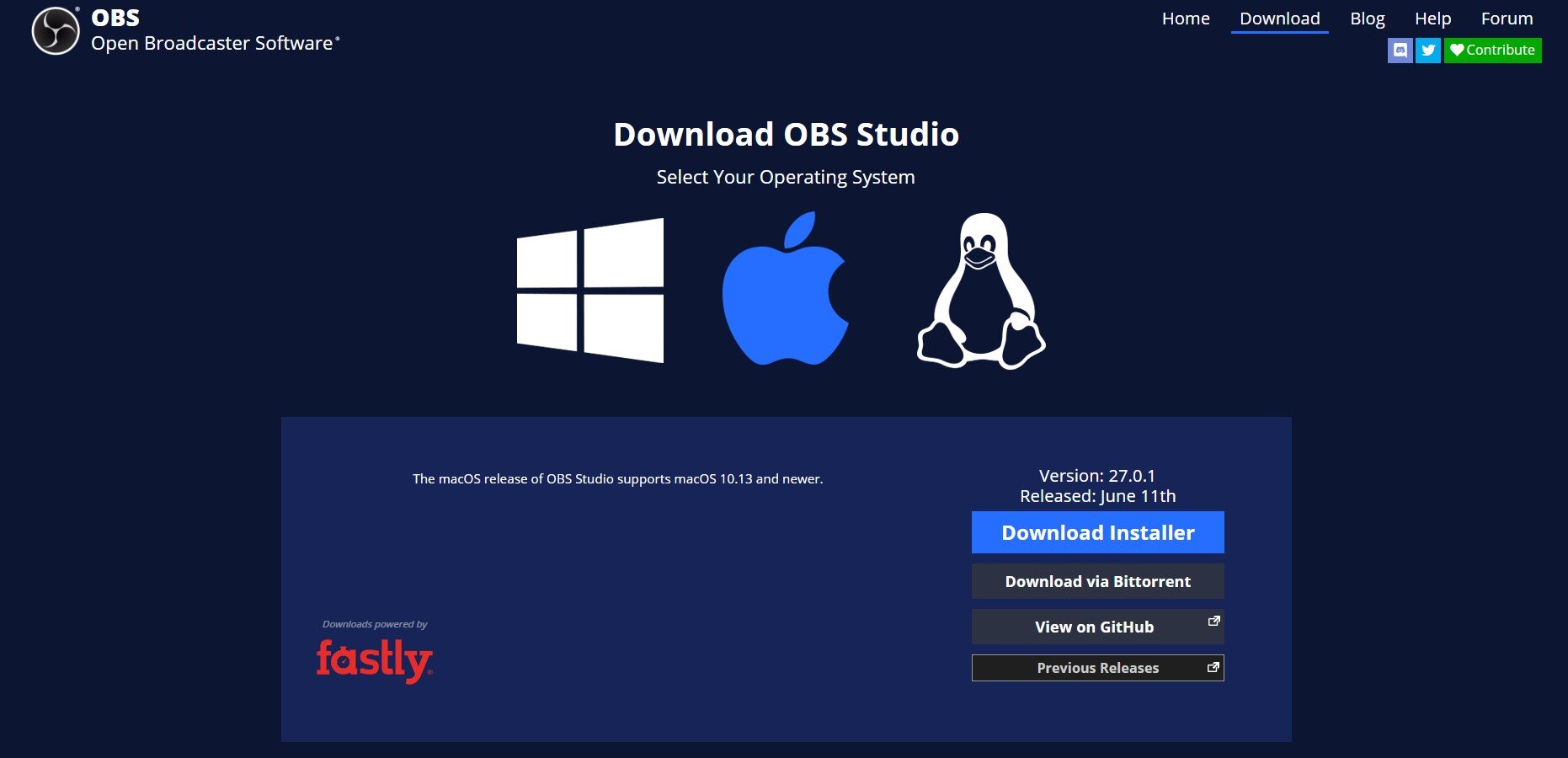 首先,点击这里访问 OBS(开放广播软件)官方网站。选择苹果系统并下载安装程序。下载 OBS 安装程序将需要几秒钟,您必须将其安装到您的系统中。下载并安装安装程序后,您可以打开OBS Studio。