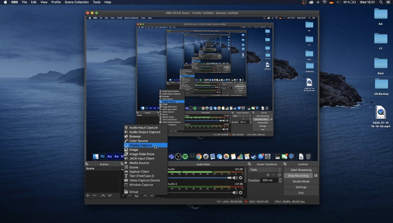 我们将向您的场景添加一些源,以使您了解其工作原理。完成后,我们将不得不进行一些设置,然后就可以了。单击加号在你的来源部分。这将打开此下拉菜单,您可以在其中选择不同的来源。如果您想录制屏幕,请选择“显示捕获源”。将其命名为您想要的任何名称,选择您想要记录的主显示,如果您愿意的话应用裁剪,然后就完成了。