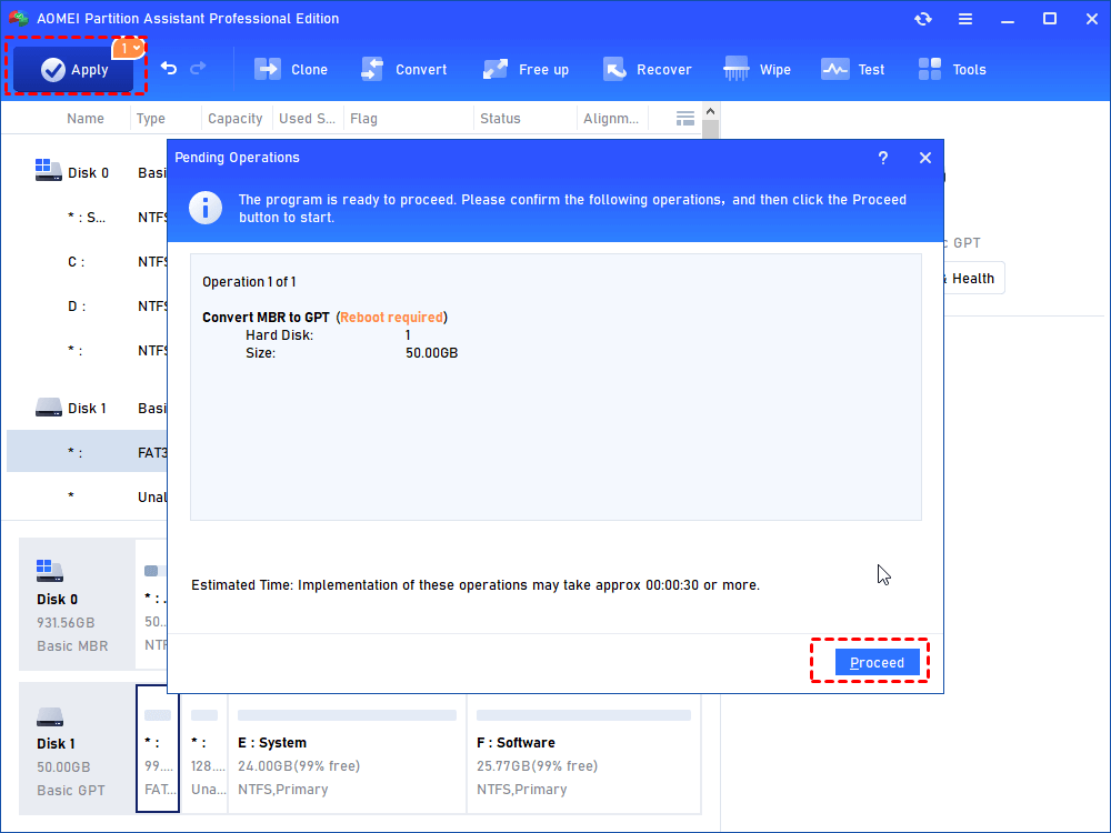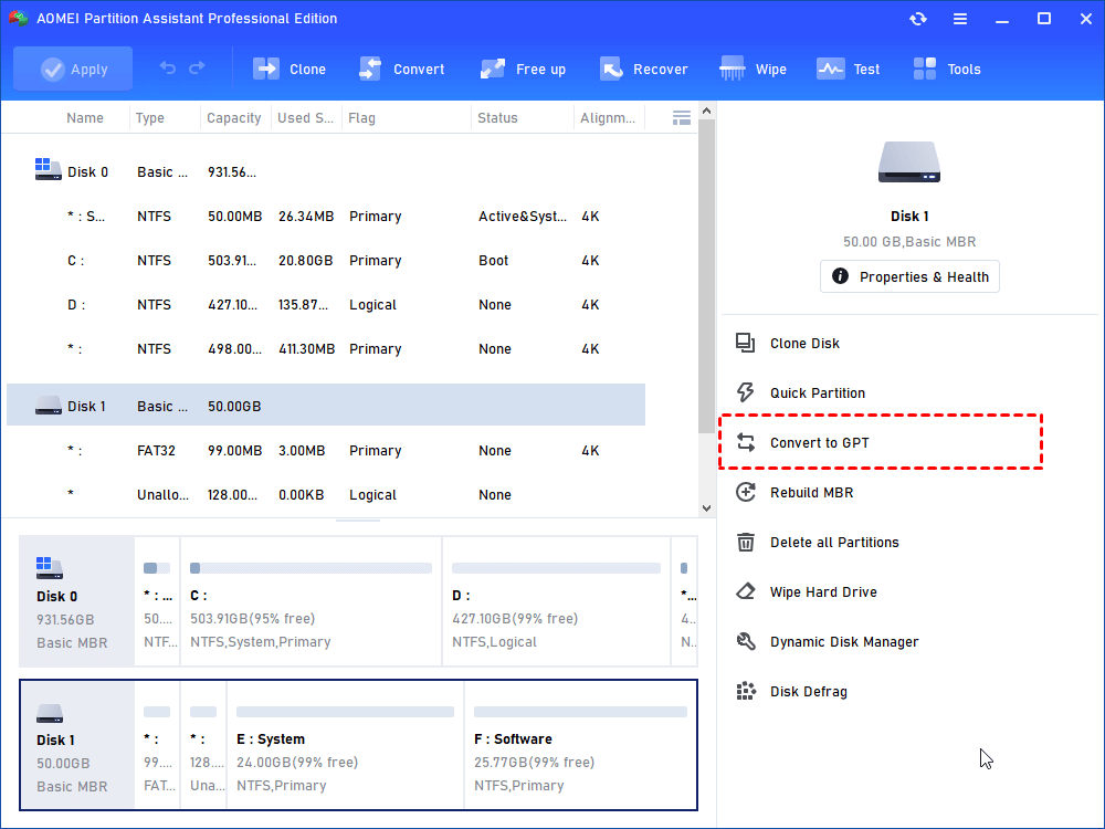 与命令提示符和磁盘管理不同,此工具不需要您清理磁盘和删除分区。您无需重新安装操作系统和其他已安装的程序。无论出于何种原因,您都可以在必要时转换分区样式。