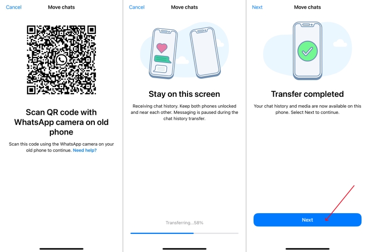 步骤 7。当您看到传输完成时,点击下一个。然后您就可以查看所有现有的聊天记录。