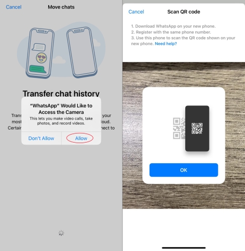 步骤 4。轻敲允许启用“WhatsApp 希望访问相机”。然后,您就可以使用旧 iPhone 上的相机扫描新 iPhone 上的二维码。