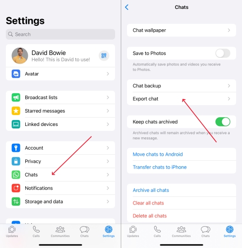 步骤2。轻敲聊天 > 导出聊天并选择您要转移的聊天记录。