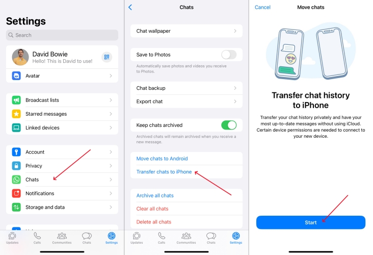 步骤 3.轻敲聊天 > 将聊天转移到 iPhone > 开始。