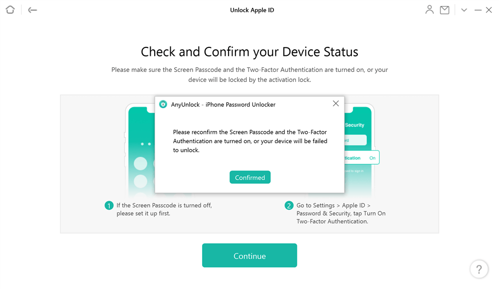 步骤3.然后,请确保屏幕密码和双因素身份验证已打开。如果没有,您的设备将被激活锁锁定 > 单击继续按钮 > 点击确认的按钮开始 Apple ID 解锁过程。