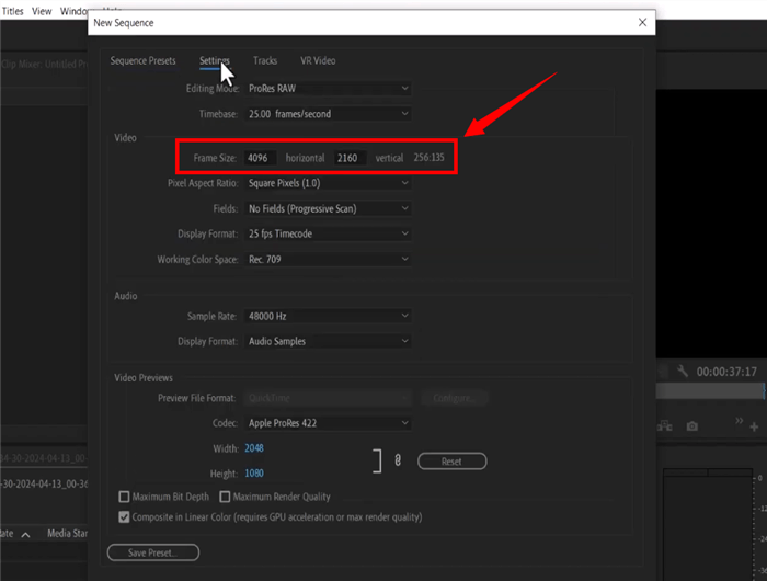 步骤 4。转到“设置”以进一步自定义预设。检查水平和垂直帧大小是否分别设置为 4096 和 2160。然后,单击“确定”。
