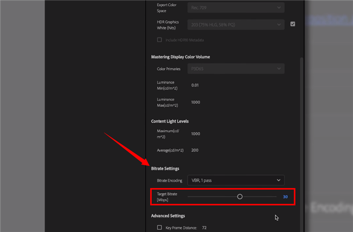 步骤8。滚动到“比特率设置”并选择“VBR,1 pass”。然后,将“目标比特率”滑块拖动到 30,以获得流畅的视频质量。完成后单击“导出”。