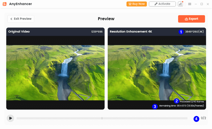 步骤 4。您将看到右侧增强视频与左侧原始视频的比较。在这里,您可以查看播放的分辨率、已处理帧数、剩余时间和帧数。