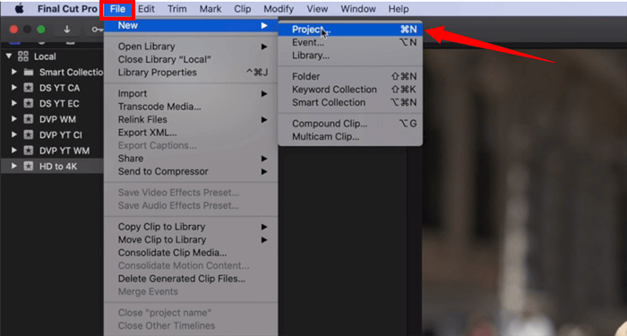 步骤2。从顶部菜单转到“文件”,然后从列表中单击“新建”。从扩展选项中选择“项目”。