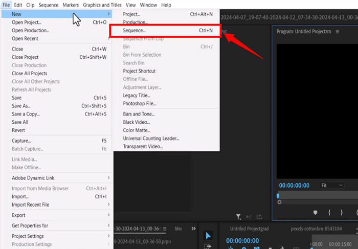步骤2。转到“文件”并将鼠标悬停在“新建”上。然后从选项列表中单击“序列”。