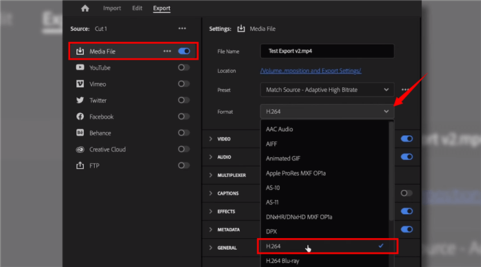 步骤 6。在 Mac 上按“CTRL+M”或“Command+M”打开“导出”菜单。展开“格式”下拉列表并从各种格式中选择“H264”。