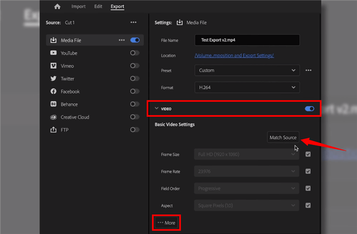 步骤 7。打开“视频”面板并单击“匹配源”将视频与您的序列设置相匹配。单击“更多”并选中“以最大深度渲染”和“使用最大渲染质量”。