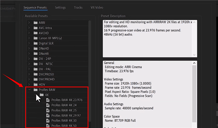 步骤 3.屏幕上将打开一个新窗口。转到“序列预设”。展开“ProRes RAW”文件夹并打开“4K”部分。选择具有所需帧速率的 4K 预设。