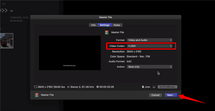 步骤 7。转到“设置”部分。打开“视频编解码器”下拉列表并选择 H.264。这将降低大文件的大小,同时保持质量。完成后单击“下一步”。