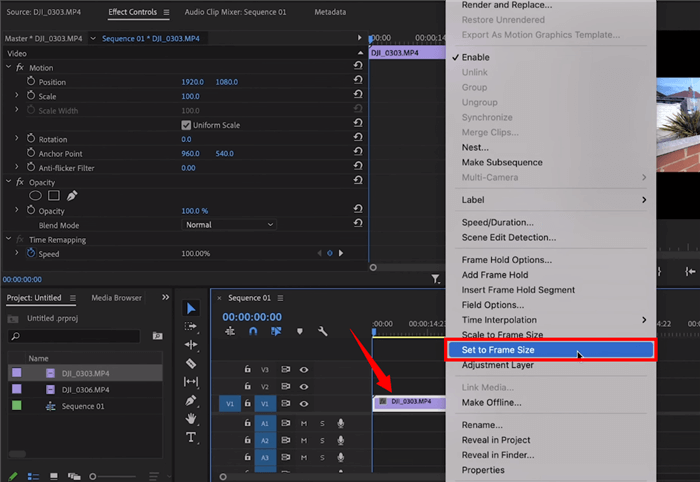 步骤 5。您的视频周围会有黑色边框,因为它比序列小。右键单击时间线中的剪辑。然后,选择“设置为帧大小”以放大视频。