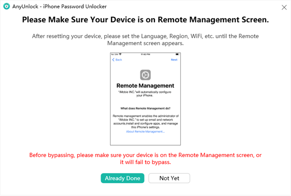 绕过之前,请确保您的iOS设备在远程管理屏幕上。否则,它将无法绕过。