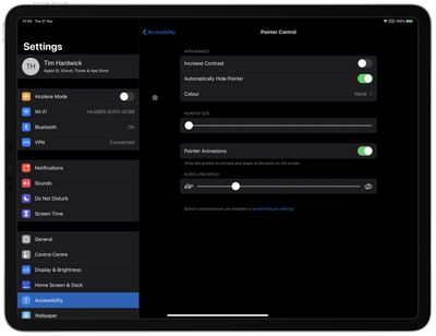 iPadOS 中还有多种鼠标设置,您可以根据自己的喜好进行更改。可以在以下选项中找到设置应用程序下常规 -> 触控板和鼠标。