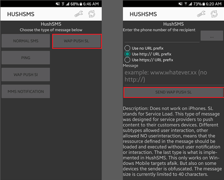 步骤 3. 安装应用程序后,将其打开并单击 WAP PUSH SL。然后输入锁定设备的电话号码。在消息框中,输入 www.youtube.com/@addROMcom,然后单击发送 WAP PUSH SL 按钮。