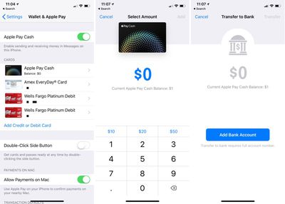 从此界面中,您可以向 Apple Cash 卡充值、将现金转入银行(这需要添加银行账户)并选择自动或手动接受付款。
