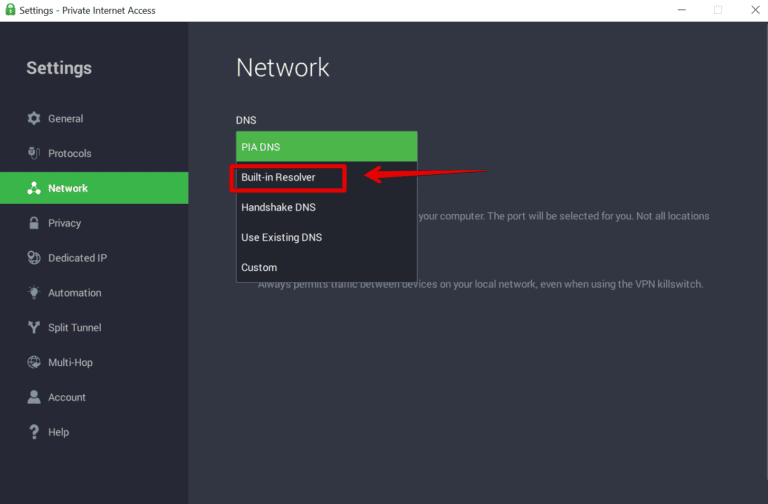 PIA 有一个内置解析器作为名称服务器选项。在此设置中,会绕过递归 DNS 服务器,您的计算机直接联系权威名称服务器以掩盖您的互联网流量。