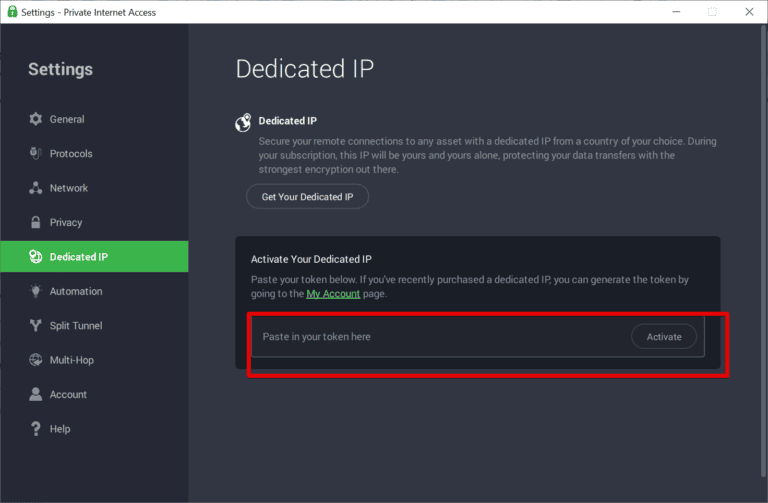 - 返回您的 PIA 应用程序,然后粘贴令牌以激活您的专用 IP 地址。
