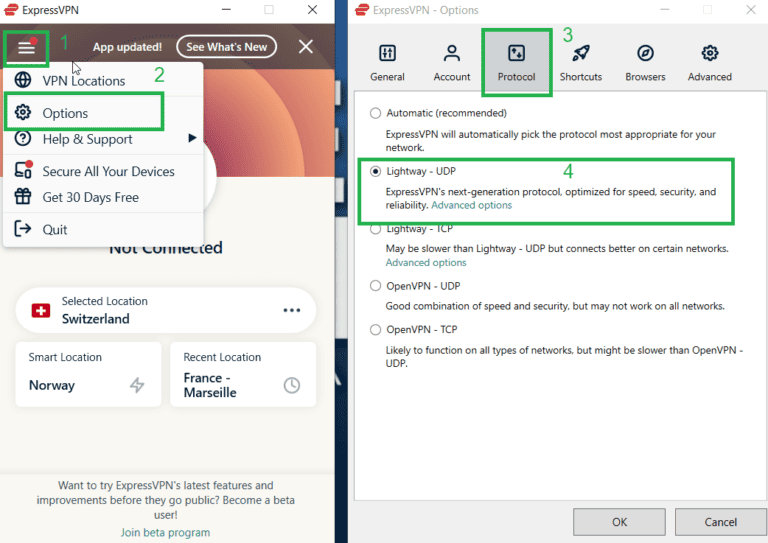 - 选择 ExpressVPN光路——UDP协议以达到速度和安全性的最佳平衡。穿过菜单图标>选项>协议>光路——UDP。