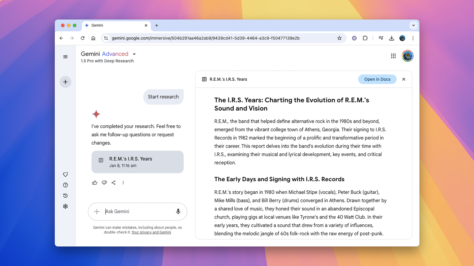 这是谷歌深度研究的第三阶段,您将逐步完成报告。但这并不一定是研究的结束:您可以针对报告中的任何内容提出后续问题,就像与双子座进行正常对话一样。如果您继续聊天,报告本身会最小化,但如果需要,您可以再次打开它。