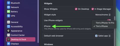 最后,如果您拥有多部 iPhone,请在系统设置 ➝ 桌面和 Dock 中的“小部件”下,有一个选项可让您选择要在桌面上镜像的 iPhone。