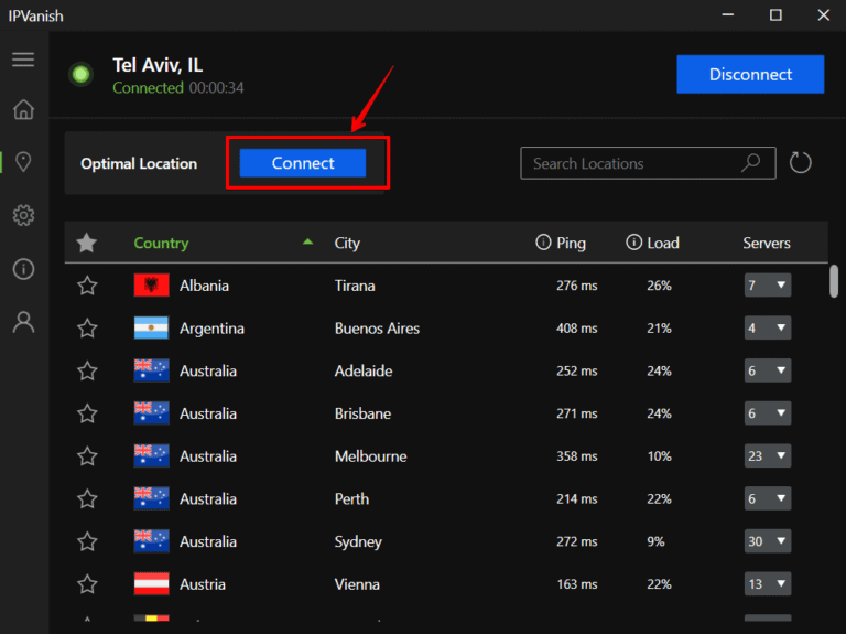 - 选择首选的 IPVanish 服务器(取决于您需要解锁的内容/流媒体平台),然后连接。