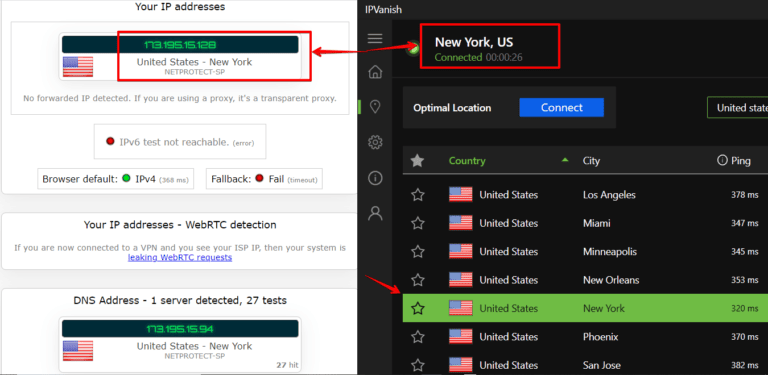 - 进行IP/DNS泄漏测试以确保您连接到所选国家/地区的 VPN IP。