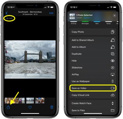 所选的“实时照片”将作为单个连续视频剪辑自动保存到您的照片库中。